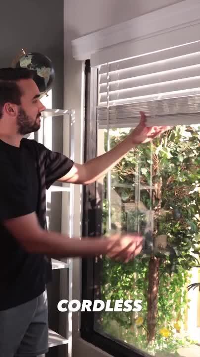 Male model showcases how to tilt, lift and lower the 2 Inch Cordless Faux Wood Blinds